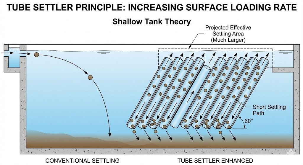 A Inclinazione di 60 gradi è ottimale per la sedimentazione perché è sufficientemente ripido da consentire ai solidi sedimentati di scivolare lungo le pareti del tubo per gravità (autopulente) pur rimanendo sufficientemente basso da massimizzare l'effettiva area di sedimentazione orizzontale.