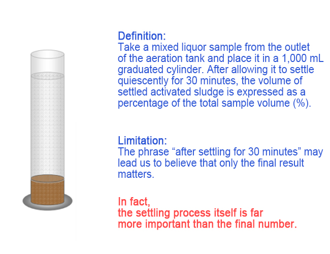 | Velocità di assestamento | Velocità di flocculazione iniziale e velocità di sedimentazione libera e flocculante; velocità con cui si forma l'interfaccia acqua-fango. | 1. Attività dei fanghi attivi (maggiore = più veloce); 2. Invecchiamento dei fanghi (più vecchi = più lenti); 3. Tossicità dei fanghi (tossico = più lento); 4. Viscosità dei fanghi (maggiore = più lenta); 5. Bulking filamentoso (nel complesso più lento); 6. Concentrazione dei fanghi (decantazione precoce del flocculante); 7. Contenuto di solidi sospesi (maggiore = più lento); 8. Temperatura e viscosità dell'acqua. |