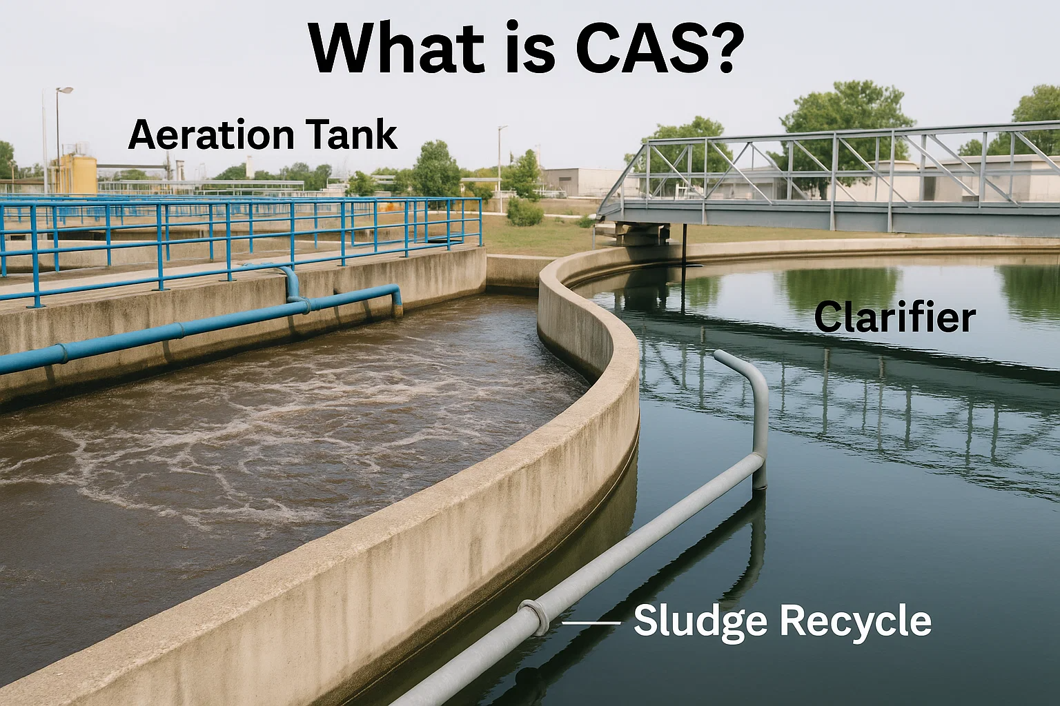 CAS è un sistema semplice ed efficace modello miscelatore-decantatore che crea le condizioni perfette affinché i microrganismi possano mangiare sostanze inquinanti e quindi separa tali microrganismi dall'acqua pulita.