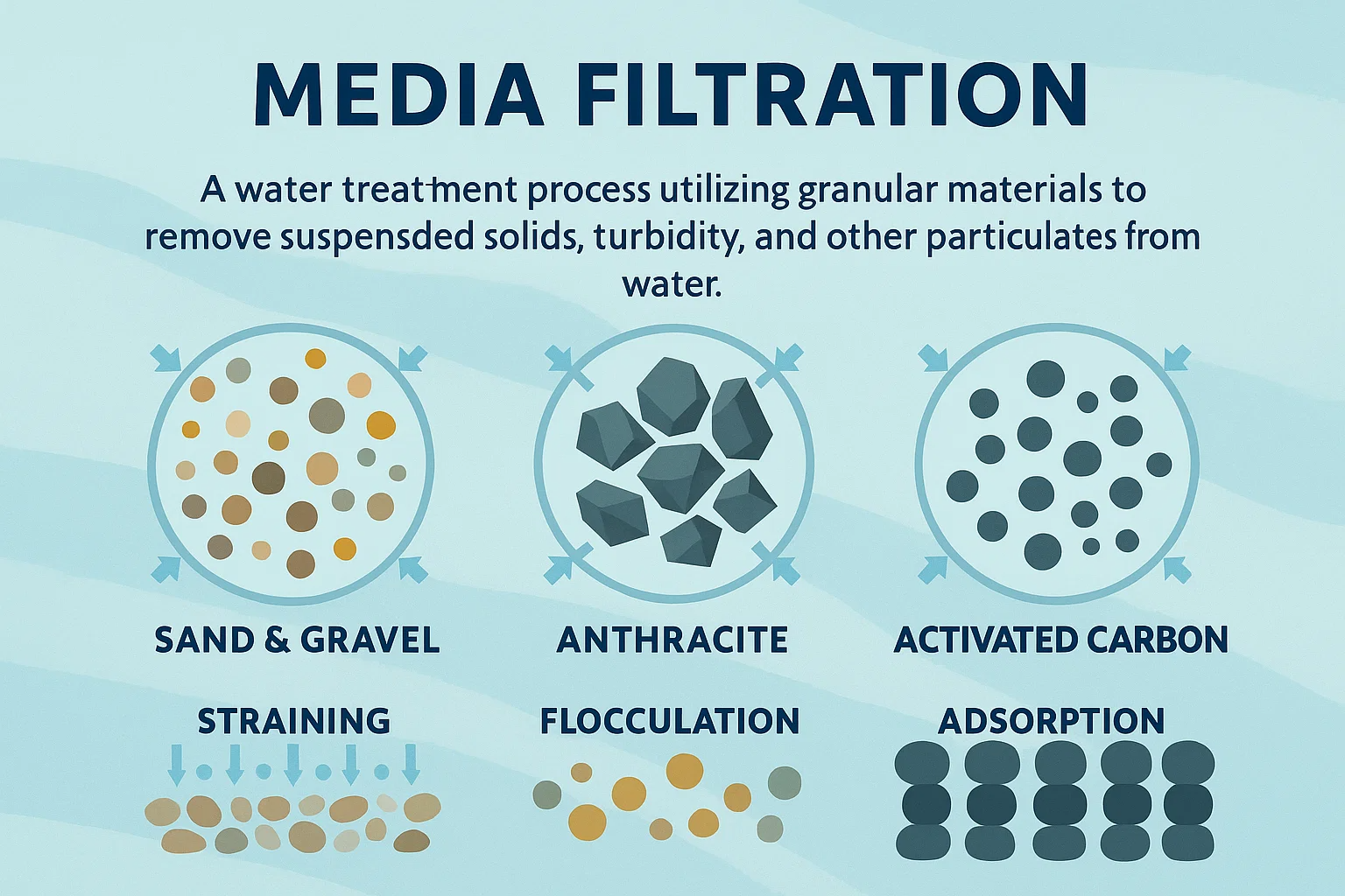 Filtrazione dei media è un processo di trattamento delle acque che utilizza un letto di materiali granulari - i media del filtro - per rimuovere i solidi sospesi, la torbidità e altre impurità dall'acqua. Questa è una forma di Filtrazione di profondità , dove le particelle vengono catturate non solo in superficie ma per tutta la profondità del letto del filtro.