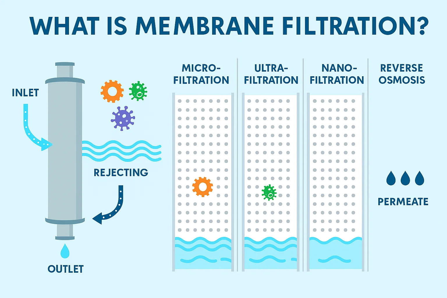 La filtrazione della membrana è classificata per dimensioni dei pori nella membrana, che determina il tipo di contaminanti che può rimuovere. I tipi principali, in ordine di riduzione delle dimensioni dei pori, sono: